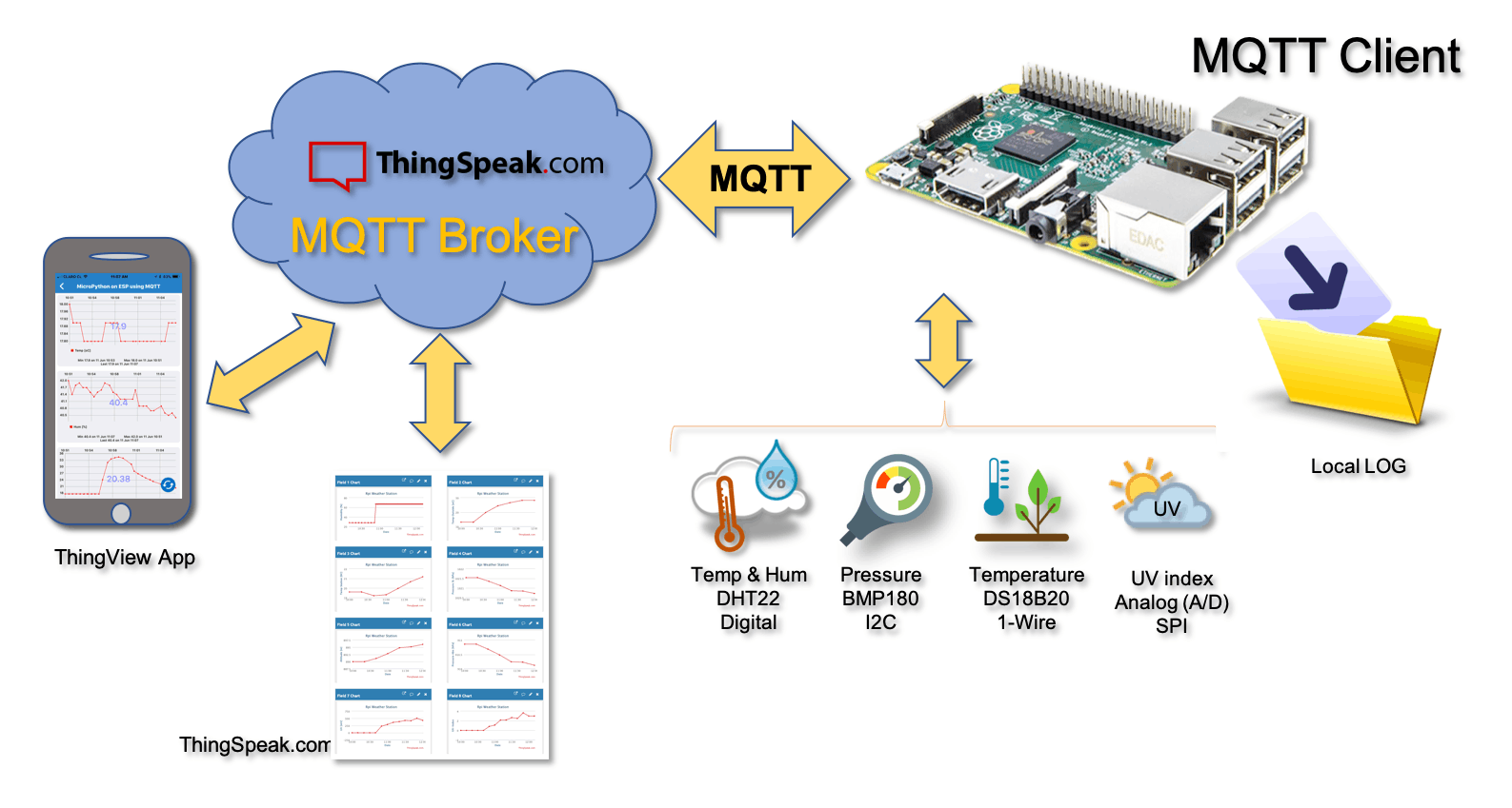 Вкратце, все данные будут собраны, сохранены локально в файле CSV и отправлены в службу IoT (ThingSpeak.com) по протоколу MQTT, как показано на блок-схеме ниже: